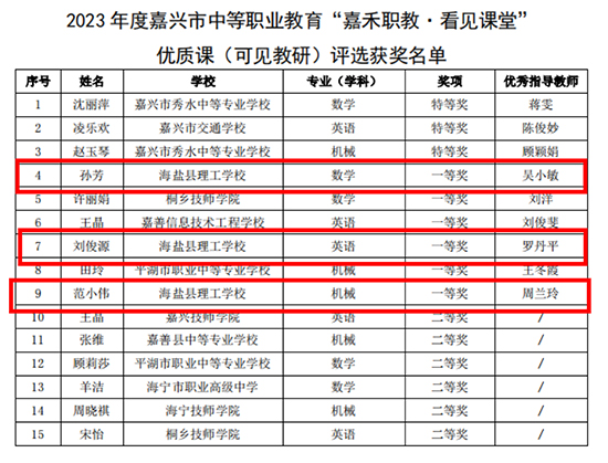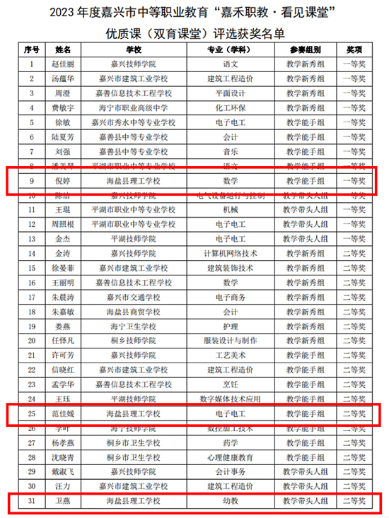 1月4日,嘉興教育學(xué)院公布了2023年度嘉興市“嘉禾職教·看見課堂”優(yōu)質(zhì)課評選結(jié)果。海鹽縣理工學(xué)校推送的6位教師均取得了優(yōu)異成績。其中,倪婷老師獲“雙育課堂”一等獎,范佳媛、衛(wèi)燕兩位老師獲二等獎;孫芳、劉俊源、范小偉三位老師均獲“可見教研”一等獎。