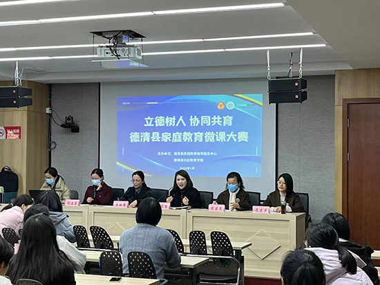 德清縣社區教育學院院長孫志惠,德清縣家庭教育指導中心主任吳敏瑾,浙江省家庭教育講師團成員、德清縣清溪小學副校長倪連芳,德清縣退休教師協會會長陳建美,德清縣社區教育學院培訓處主任高建萍,辦公室主任管黎等出席并擔任評委。