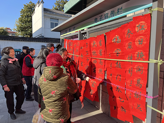 活動現場,春聯紙、毛筆和硯臺被整齊地擺放在桌子上,鮮紅的紙張渲染著濃濃的節日氛圍,書法老師們挽袖執筆,揮毫潑墨,一幅幅承載著對美好生活的向往的祝福在紙上展現。圍觀的社區居民熱情高漲,書法老師根據社區居民的要求,認真書寫。墨寶的清香與眾人的歡笑,讓龍年的年味和幸福上墅的文化氣息更加濃厚。“吉星高照家富有,大地回春人安康”,“龍騰四海賀新春,鳳舞九天報吉祥”……不一會兒的功夫,一幅幅書寫工整、飽含祝福的對聯躍然紙上,給現場增添了別樣的色彩,濃濃的年味撲面而來。