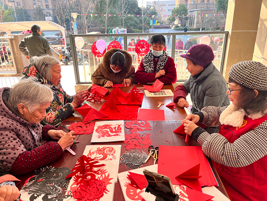 不遠處的樓道里傳出宛轉悠揚的戲曲聲,一曲經典越劇在文明樓道睦鄰廳內拉開帷幕,這是熱愛戲曲的居民們自發組建的一支表演團隊,他們中年紀最大的已達到75歲,因為藝術讓他們相遇,因為熱愛讓他們聚集在此。現場來了不少觀看表演的居民,時不時發出熱烈的叫好聲;隔壁的共享廳也不閑著,來自太湖街道成校的王老師正在剪窗花指導,現場還開起了抖音直播,大家認真學著各種剪紙技巧,盡情地發揮自己的創意,切身感受中華民族傳統民間藝術的魅力,春、福、喜、龍……大家剪出各式各樣的美妙圖案,借一剪一紙,裁出紙上年味,傳達樸素愿望,喜迎龍年新歲月。黨員志愿者和樓道長們則是在一旁為前來的孩子們制作爆米花,一粒粒香甜可口的爆米花帶來的不止美味,更是孩子們對新春的期盼!