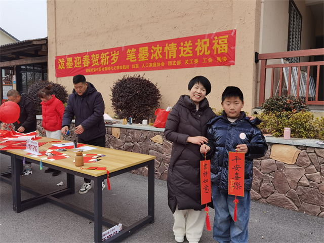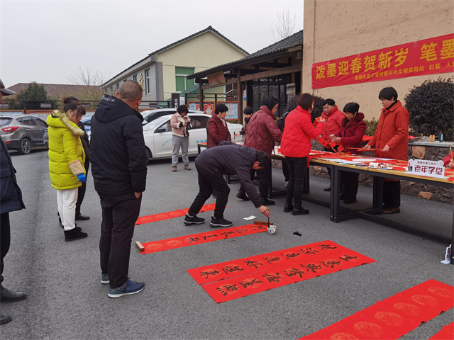 1月27日上午,安吉縣社區(qū)教育學(xué)院遞鋪分院組織老師赴三官村寫(xiě)對(duì)聯(lián)送祝福,邀請(qǐng)了汪華忠,邱立美,盛心武等老師現(xiàn)場(chǎng)書(shū)寫(xiě)福字和對(duì)聯(lián)。來(lái)自三官村的幾十位村民到場(chǎng)領(lǐng)取了新春祝福。