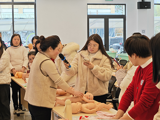 開課首日,遂昌縣人民醫院原護士長、資深護理專家朱香紅為學員們進行母乳喂養和嬰幼兒撫觸訓練。