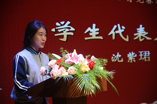 沈紫珺同學發言,他講述了自己的備賽經歷,分享了自己對輸贏的感悟和體會,并感謝學校、體育組和教練對自己的培養,表示將珍惜機會、努力訓練、為校爭光。