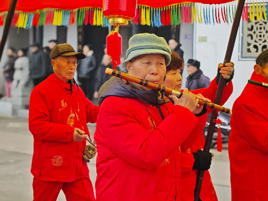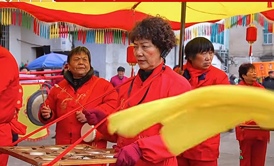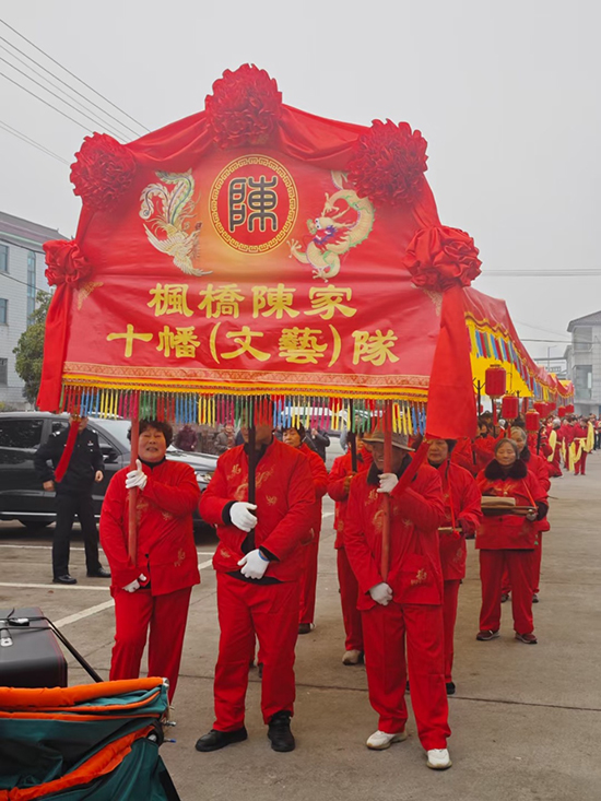 巡演隊(duì)伍早早地聚集在楓橋鎮(zhèn)陳家社區(qū)的敦倫堂廣場(chǎng)。時(shí)間一到,楓橋鎮(zhèn)陳家社區(qū)黨總支書(shū)記陳樂(lè)琴宣布“‘陳家十番’巡演開(kāi)始!”鞭炮鳴放,鑼鼓喧鬧,一條長(zhǎng)約200米左右、寬2米的大番被人抬起,番中間是大幅的黃色面料、兩側(cè)點(diǎn)綴著紅黃藍(lán)相間的流蘇,遠(yuǎn)看似一頭奔跑的獅子,形似獅頭的周邊用大紅花裝飾、正上方鑲嵌著一個(gè)圓形用金黃絲線滾邊、金鳳與祥龍托著的繁體篆書(shū)“陳”字,下方書(shū)寫(xiě)著紅底黃色繁體的“楓橋陳家十番(文藝)隊(duì)”幾個(gè)大字,長(zhǎng)番下穿插著手持各種吹打樂(lè)器和抬番人員60人左右。一路鼓磬齊鳴,充滿著歷史的鄉(xiāng)愁和時(shí)光的旋卷,天樂(lè)流音,輕輕地飄逸,繞梁回蕩;笙簫琴笛、輕鑼木魚(yú)、響板合奏,恰似天籟之音,仙樂(lè)飄飄。巡演路上,莊重喜樂(lè)的氛圍,箏笙簧管弦,宮商角徵羽,鑼鼓響,鐃鈸擊,魚(yú)磬敲,蘆笙吹,應(yīng)有盡有。街坊路人絡(luò)繹不絕放緩或停下來(lái)好奇地觀看,陶醉在華彩四射、輕風(fēng)漫飄、音調(diào)古樸的江南絲竹之音中。