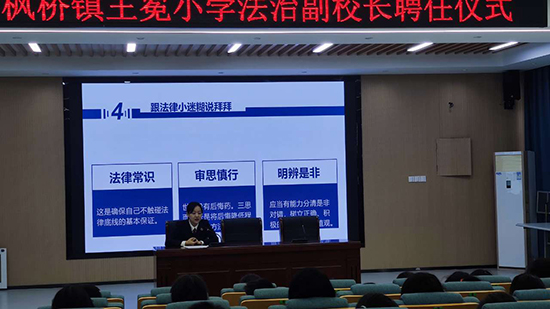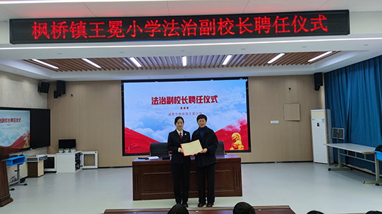 據(jù)悉,楓橋鎮(zhèn)王冕小學(xué)為了加強(qiáng)學(xué)校師生對(duì)法制觀念的了解,進(jìn)一步增加校園安全系數(shù),邀請(qǐng)專業(yè)人員進(jìn)校開展專題講座,提升師生素質(zhì)。講座后,學(xué)校聘請(qǐng)魏夢(mèng)迪為學(xué)校法制副校長(zhǎng),校長(zhǎng)趙娜當(dāng)場(chǎng)頒發(fā)了聘書,為學(xué)校今后的教育工作保駕護(hù)航。(孫文明)
