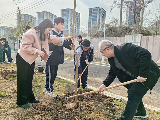 植樹現場,師生互相協作,配合默契。挖坑、培土、澆水。經過一番辛勤努力,一棵棵小樹苗在大家的精心呵護下挺立起來,煥發出勃勃生機。