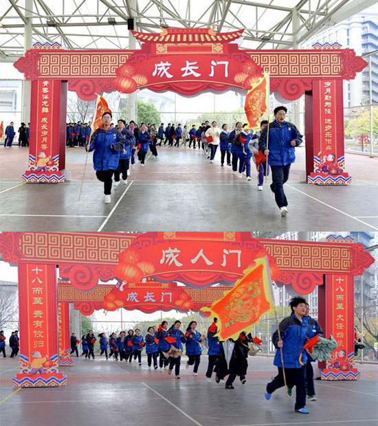 礪行致遠(yuǎn)正青春,劍指長空諾誓言;承禮冠笄擔(dān)重任,金榜亮劍顯本色。在激昂的音樂聲中,同學(xué)們依次跑過成人門、成長門和成才門,在奔向未來的路上,他們勇往直前!(杭州市臨平職業(yè)高級中學(xué))