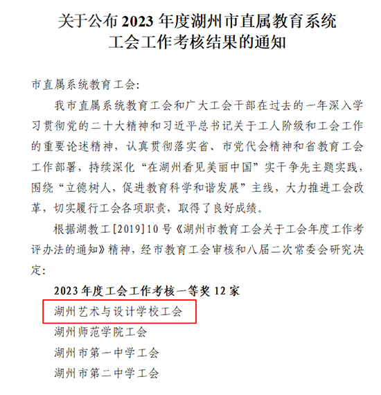 近日,湖州市教育工會八屆二次委員(擴大)會議順利召開,會上表彰了湖州市直屬基層教育工會工作考核一等獎的12家工會,浙江省湖州藝術(shù)與設(shè)計學(xué)校工會在眾多考核單位中位列第一。