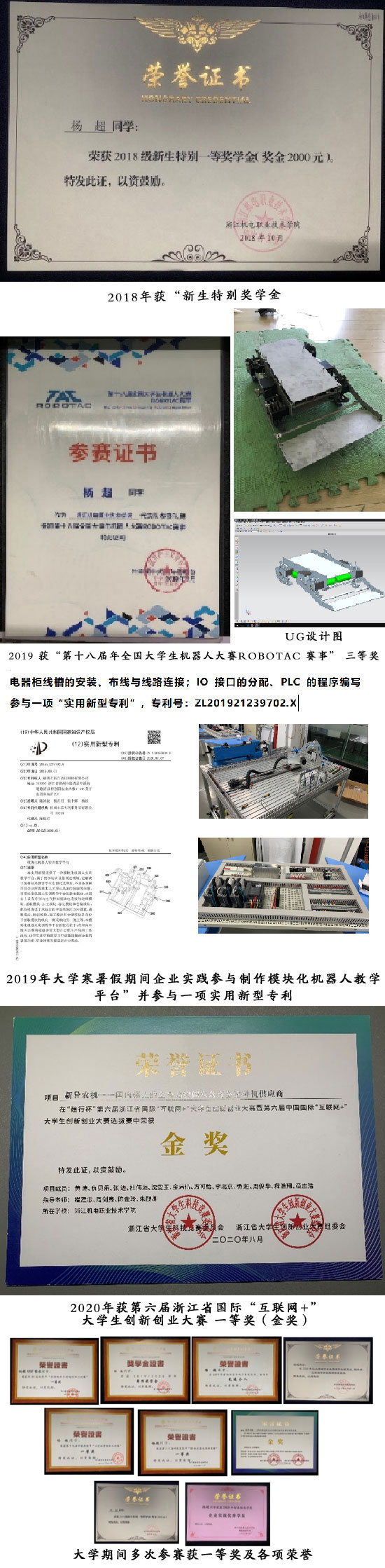 國賽一等獎讓楊超獲得了大學免試入學的機會,隨后,他進入浙江機電職業(yè)技術學院進行深造。大學期間,仍舊積極參加各類比賽,取得了不錯的成績。在大學寒暑假期間,還積極參加企業(yè)實踐,發(fā)揮了專長優(yōu)勢,為企業(yè)做出了貢獻,并取得了一定成果。