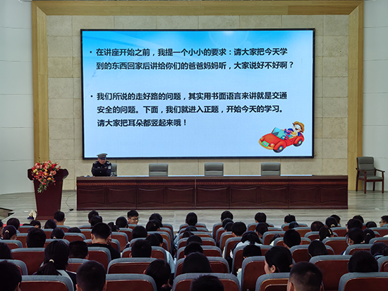 應(yīng)利輝從道路交通事故嚴(yán)峻的形勢(shì)說起,指出“從小養(yǎng)成遵守交通法規(guī)、文明出行的良好習(xí)慣”是非常必要的,請(qǐng)求學(xué)生“把今天學(xué)到的東西回家后講給你們的爸爸媽媽聽,大家說好不好???”得到異口同聲果斷的回答“好!”