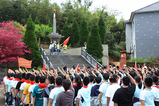 來到烈士墓前,在兩位主持人的主持下集體唱《中國少先隊隊歌》,童稚嘹亮的歌聲頓時回蕩在山林四周。四位少先隊員代表神情肅穆莊重地向烈士墓敬獻花籃。全體肅立,向革命先烈默哀。少先隊員代表在墓前獻詞,表達對烈士的崇敬與緬懷之情。德育主任金鐵鋒介紹葛理庸烈士的事跡。三個中隊的代表分別朗讀革命詩歌緬懷先烈的壯志與無畏的精神。大隊輔導員孟潔引領全體隊員重溫少先隊宣誓詞,鏗鏘有力的誓言表達了堅強的意志和堅定的信念。全體隊員分別擦拭墓碑、清掃四周,依序瞻仰紀念碑,向烈士敬獻自己親手制作的小白花。禮畢有序返回學校。