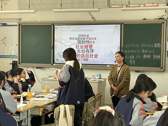 海鹽縣理工學(xué)校朱菱芳老師展示了公開課《走進(jìn)鄉(xiāng)土,追根溯源——“長老統(tǒng)治”閱讀》,她通過新穎的教學(xué)方式、豐富的視頻資源和深入的講解引導(dǎo),使學(xué)生理解了社會繼替、教化權(quán)力和長老統(tǒng)治等概念,并激發(fā)了他們對鄉(xiāng)土文化和社會現(xiàn)象的思考。