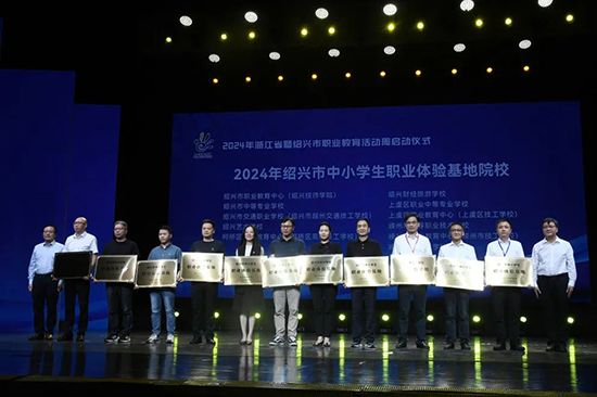 啟動(dòng)儀式上,領(lǐng)導(dǎo)們?yōu)榻B興市中小學(xué)職業(yè)體驗(yàn)基地進(jìn)行授牌。柯橋區(qū)職業(yè)教育中心成功入選。鐘建康書記代表學(xué)校上臺(tái)接受授牌。