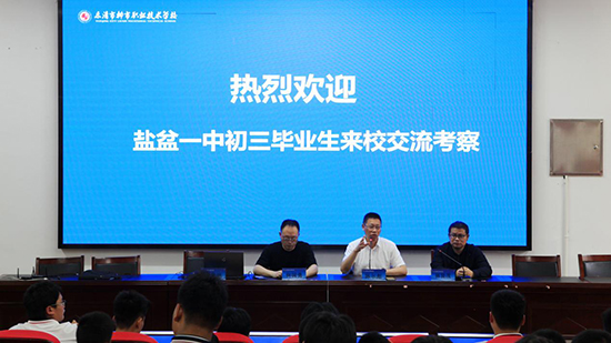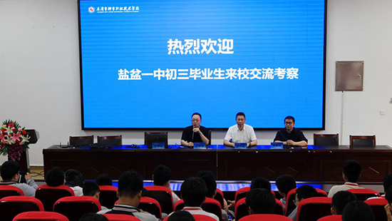 參觀體驗(yàn)結(jié)束后,學(xué)生在階梯教室集合參加學(xué)校講座。何國勇致辭,對鹽盆一中來校參觀的學(xué)生和帶隊(duì)老師表示熱烈歡迎。并從學(xué)校概況、專業(yè)設(shè)置、教學(xué)特色、培養(yǎng)成果等四個方面進(jìn)行了介紹。