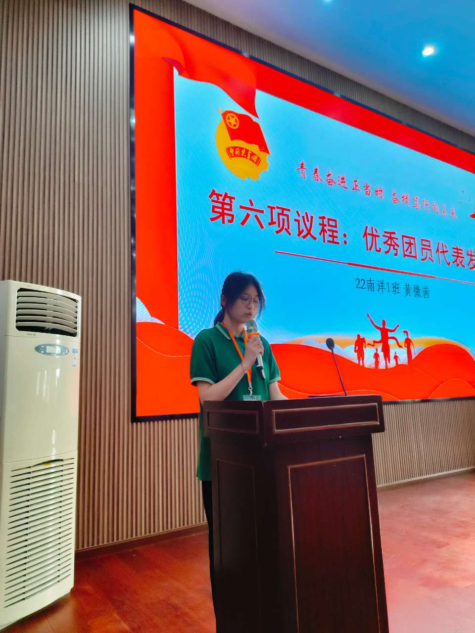 22南洋1黃微茜同學代表優秀團員發言,她對新團員說:“在團組織中,你們將收獲成長與進步。在這里,你們將學習有關于黨,團的理論,參與實踐活動,培養團結協作精神,成為有理、有道德、有文化、有紀律的共產主義事業接班人。作為團員,我們要以身作則,傳遞正能量,影響和帶動身邊的人。”