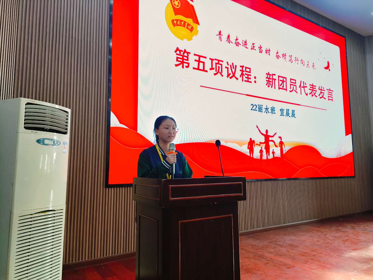 22麗水宣晨晨同學代表新團員發言,她對新團員說:“我們不僅要為成為團員而感到光榮,更應該深刻認識到我們應盡的義務。首先,我們要牢記自己立下的誓言,在今后的學習和生活中,時刻以身作則,起到模范帶頭作用。同時,我們要自覺遵守校紀校規,盡力為學校,為班級做貢獻,學好科學文化知識,強化職業專業技能,力爭成為新時代優秀的共青團員。”