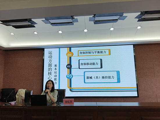 浙江省軍區(qū)汪莊幼兒園副園長金紅芳作專題講座《基于運動核心經(jīng)驗的幼兒園體育活動實踐》,金園長先從健康核心經(jīng)驗入手,帶著老師重新溫習(xí)小中大三個年齡段幼兒健康領(lǐng)域的發(fā)展目標(biāo),再通過幾個優(yōu)秀的體育教學(xué)案例向老師介紹了幼兒園體育活動在日常教學(xué)中的實踐。