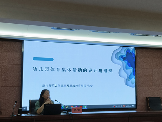 培訓(xùn)期間,浙江師范大學(xué)兒童發(fā)展與教育學(xué)院學(xué)前教育系教授張瑩帶來了專題講座《幼兒體育活動設(shè)計》和《幼兒園游戲中教師的自我評價》,在講座中張教授從體育活動的價值、集體教學(xué)活動成功要點、體育集體教學(xué)活動設(shè)計框架、幼兒的發(fā)展評價等四個方面展開講解,通過實際案例的展示、現(xiàn)場的互動,讓學(xué)員深刻認(rèn)識到幼兒體育集體活動的重要性,也從中學(xué)到許多實用的設(shè)計和組織技巧,為學(xué)員今后的教學(xué)工作提供了寶貴的建議。