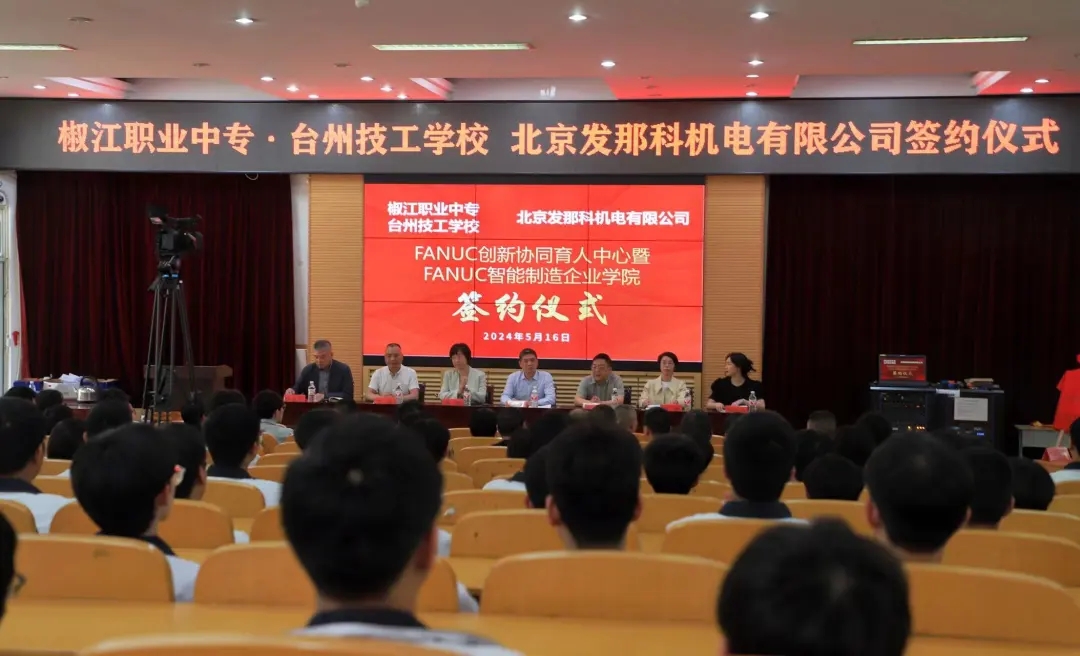 為進一步深化校企合作,推動產學研用一體化發展,實現校企雙方合作共贏,5月16日下午,2024年椒江區職業中專·臺州技工學校與北京發那科機電有限公司簽約授牌儀式在校階梯教室隆重舉行。臺州市教育局二級調研員林鑒兵,椒江區教育局副局長陳耀,椒江區人社局副局長梁微,椒江區教育局職成教科科長許玲玲,北京發那科機電有限公司F+學院院長梁靜,椒江職業中專校長丁旻出席儀式。椒江各級工匠,椒江職業中專班子成員、相關部門負責人及師生代表共同參加儀式。