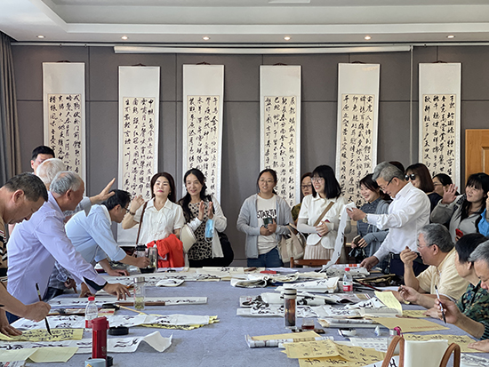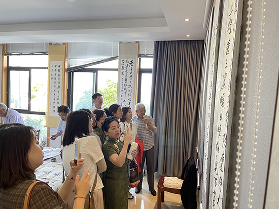“屬雞的詩(shī)在哪里?”“有屬猴的詩(shī)嗎?”考察團(tuán)成員在書(shū)法創(chuàng)作室被“左筆書(shū)法大師”顧關(guān)心老師的書(shū)法作品吸引,紛紛用手機(jī)拍照留存。