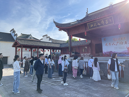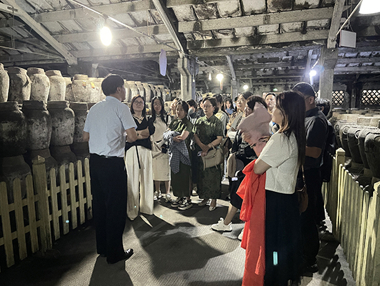 隨后,考察團(tuán)參觀了學(xué)校的校外教學(xué)實(shí)踐基地——古越龍山中央酒庫(kù)和安橋頭村“魯迅外婆家”景區(qū)。在古越龍山中央酒庫(kù),考察團(tuán)成員聞著酒香,跟著講解員一道追溯紹興黃酒源遠(yuǎn)流長(zhǎng)的歷史文化。他們?cè)谘b飾精美的花雕酒壇前流連,在一排排堆疊如山的陳年酒壇前打卡,欣喜之情溢于言表。在安橋頭村“魯迅外婆家”景區(qū),考察團(tuán)成員跟隨講解員先后參觀了祝福廣場(chǎng)、魯美動(dòng)漫基地、文化禮堂、朝北臺(tái)門(mén)等景點(diǎn),沉浸式感受著魯迅先生小時(shí)候在外婆家跟小伙伴們一起看社戲、釣河蝦、弶鳥(niǎo)雀、抓跳魚(yú)兒等有趣的童年生活。