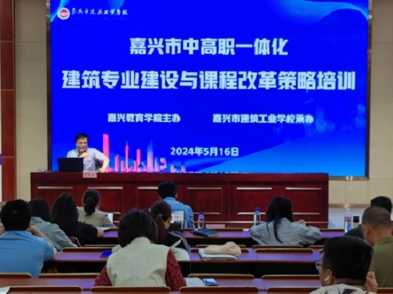 與時俱進以研促教,立足專業凸顯特色。5月16日,嘉興市建筑類專業中高職一體化專業建設與課程改革策略培訓在嘉興市建筑工業學校鼎建大講堂舉行,嘉興教育學院建筑教研員范家柱、嘉興職業技術學院城市建設學院院長谷偉、嘉興南洋職業技術學院船舶與建筑學院副院長吳雁、嘉興市建筑工業學校副校長葛魁,為來自嘉興市建筑工業學校、嘉興市秀水中等專業學校和桐鄉技師學院參與培訓的64位教師,分別做了專題講座或是經驗分享。