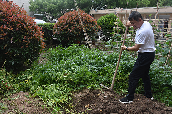 一到田間,大家開(kāi)始分工合作,有的拔草,有的鏟土,有的撿土豆,有的掘地,把一個(gè)個(gè)深藏泥土的小土豆挖出來(lái),田間地頭呈現(xiàn)出一片熱火朝天的勞動(dòng)景象。在各位老師共同的努力下,一袋袋土豆整齊擺放在田間的地里,各位老師在辛苦農(nóng)作后滿臉通紅,汗如雨下,但心里甜滋滋的。