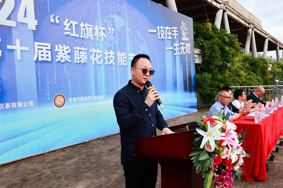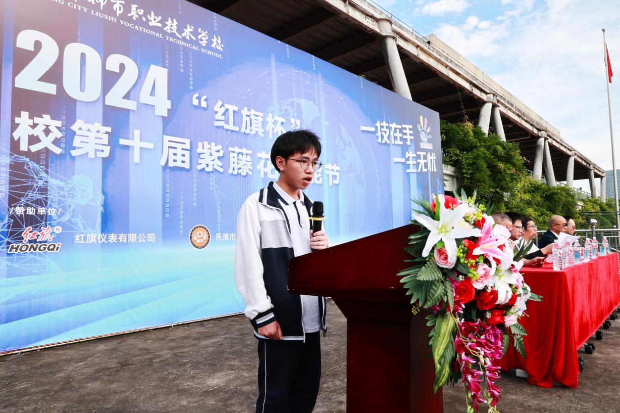 5月14日,樂清市柳市職業技術學校舉行‘紅旗杯’校第十屆紫藤花技能節。開幕式上,21計1班級潘仕華(浙江省學生技能比賽二等獎)作為參賽學生代表發言,他認識到職業技能是職業學校學生安身立命的根本,是展現自身能力、實現自我價值最直接的途徑,他將以文明的方式參與比賽,以良好的道德風尚和專業的技能知識,在比賽中研習技藝、切磋技巧,賽出風格,賽出精彩!