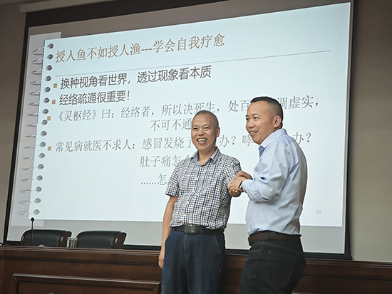 中醫健康養生班邀請了新昌縣中醫院三位名醫坐堂授課,從不同角度普及了中醫養生知識。梁君妃主任護師著重講解夏季人體特點、夏季高發疾病及養生要點。特別提供了實用的夏季養生良方。對拔罐、刮痧等中醫傳統調理技術作重點指導。 楊曉初主任醫師講課的主題是《學點中醫 頤養天年》。他從西醫和中醫是兩個不同思維模式入手,講授養生秘密:疏通經絡、改變溫度;鼓勵大家樹立正確的養生理念。楊醫師進行“脈息比”的現場操作,學員互相搭脈、測呼吸、計算,課堂氣氛活躍。王正元醫生講的是《中醫養生之中成藥篇》,他教給學員的是中成藥使用方法,中成藥服藥時間,中成藥的使用劑量,中成藥的特點等。例舉內科、外科、婦科、五官科、骨傷科等不同科室的常用中成藥,就藥物的主要成分、功效及注意點做了詳解。學員認真做著筆記,還不時舉手提問,對學習充滿了熱情。聽了醫師們的專業授課,表示要樹立正確的生活方式,不道聽途說,“最好的醫生是自己”,“健康是送給自己最好的禮物”。
