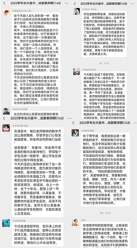 本次愛心體驗(yàn)活動(dòng),讓每個(gè)新教師近距離地接觸到培智學(xué)校的學(xué)生,大家感受頗深,紛紛寫下了自己的活動(dòng)感言。本次活動(dòng),新教師們真切地體會(huì)到關(guān)注每個(gè)學(xué)生的成長和幸福,是教育的意義和使命。(施愛良)