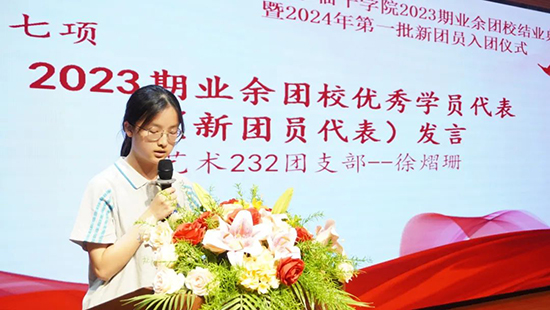 藝術232徐熠珊作為優秀學員(新團員代表)代表發言,她表示會用更高標準要求自己,做好一名優秀的共青團員,并呼吁在場的所有學員積極提升自我,以飽滿的熱情迎接團的考驗,貢獻自己的青春力量。