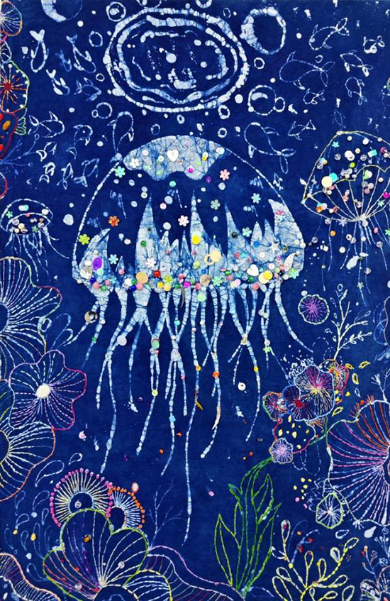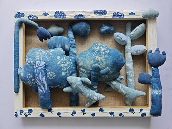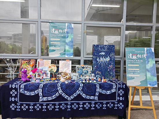 步入展區(qū),首先映入眼簾的是一大幅蠟染作品。學生通過親手繪制、染色、脫蠟等步驟,將傳統(tǒng)蠟染技藝、刺繡技藝與現代審美相結合,創(chuàng)作出了這幅耳目一新的蠟染作品。