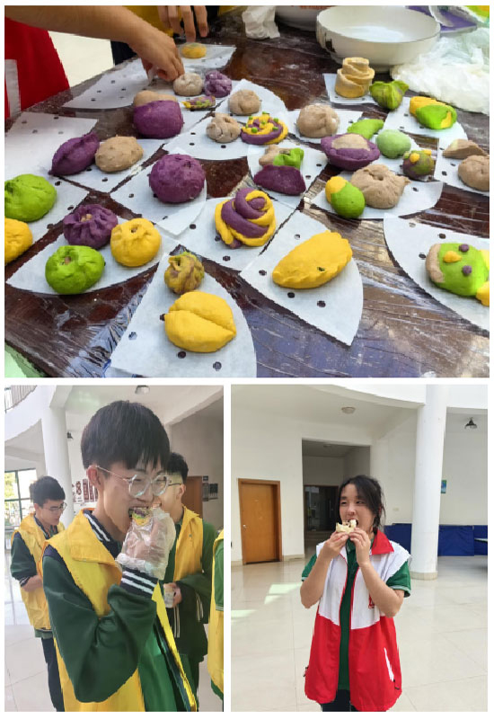 在社區工作人員的帶領下,先準備各種顏色的蔬菜汁(如菠菜汁、胡蘿卜汁等)用于面團染色。再由同學們分組進行饅頭制作,同學們可以選擇自己喜歡的五谷、六畜或瓜果蔬菜等形狀進行創作。使用蔬菜汁為面團上色,創造出豐富多彩的作品。