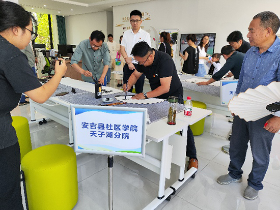 互動結(jié)束后,由天子湖分院邀請的安吉書畫協(xié)會會員劉云林老師及周金華老師為活動現(xiàn)場“添磚加瓦”,只見劉老師揮動手中的墨筆,一筆一畫地勾勒著,不一會兒功夫,一幅靈活靈現(xiàn)的蓮花畫就映入眼簾,并在畫上題上“出淤泥而不染,濯清漣而不妖”。隨后,周老師也緊跟其后,在折扇上為在場的各單位代表題上詩句。