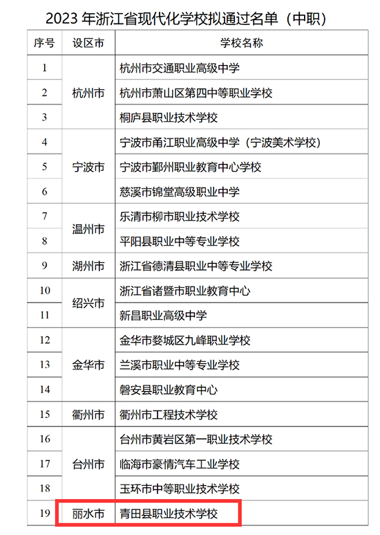 提品質、強內涵,攀高躍階再添新功。2021年,學校啟動現代化學校創建工作。創建以來,學校對標對表開展工作,制定時間表、路線圖,堅持分類施策、精準施策,推進創建工作。2023年11月13日,省現代化學校評估組專家到校現場評估驗收,對學校創建工作給予高度評價。2023年12月29日,省教育廳、省人民政府教育督導委員會發文公示評估結果,學校成功獲評省中職現代化學校,全省共19所中職學校獲評,麗水市僅1所。這是學校繼成功獲評浙江省中職改革發展示范校、浙江省“三名”工程建設單位、浙江省“雙高”項目建設單位以來,提升學校辦學品質的又一標志性工程。獲評浙江省現代化學校,不僅代表學校硬件的現代化,更體現了學校教育理念的現代化、人才培養的現代化,是當前最能綜合反映學校辦學水平、最具含金量的省級榮譽。