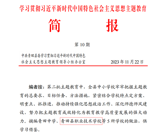 守初心、固根基,主題教育見行見效。全校上下深入開展學習貫徹習近平新時代中國特色社會主義思想主題教育,以主題教育成果賦能職業教育高質量發展,學校學習貫徹習近平新時代中國特色社會主義思想主題教育的做法在縣委主題教育工作簡報刊發。全面落實黨組織領導的校長負責制,堅持黨對學校工作的全面領導,不斷優化黨建工作機構設置,充分發揮黨組織的核心作用,以“黨建+”形式融合學校“青石文化”,以“黨建+文化建設”“黨建+隊伍建設”“黨建+教學改革”“黨建+群團工作”為抓手,全面推進四個“黨建融合”,不斷豐富“青石”黨建內涵,鑄就“青石”黨建品牌。深入開展“僑頭堡·青田紅”強基示范中小學創建工作,全面統領學校事業發展。5位同志獲評青田縣教育系統優秀黨員、優秀黨務工作者稱號。學校黨總支榮獲2023年教育系統“先進基層黨組織”稱號、全縣機關黨建優秀課題研究成果一等獎。