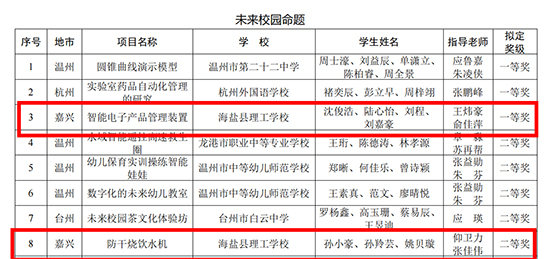 5月31日至6月1日,第十屆全國青年科普創新實驗暨作品大賽(浙江賽區)復賽在浙江省科技館如期舉行。在本次大賽“未來校園命題”賽項中,海鹽縣理工學校取得了令人矚目的成績。其中,沈俊浩、陸心怡、劉程、劉嘉豪團隊獲省一等獎,指導老師王煒豪、俞佳萍;孫小豪、孫羚蕓、姚貝璇團隊獲省二等獎,指導老師仰衛力、張佳偉。他們如同璀璨的星辰,再次在科學的天空中劃下亮麗的軌跡。