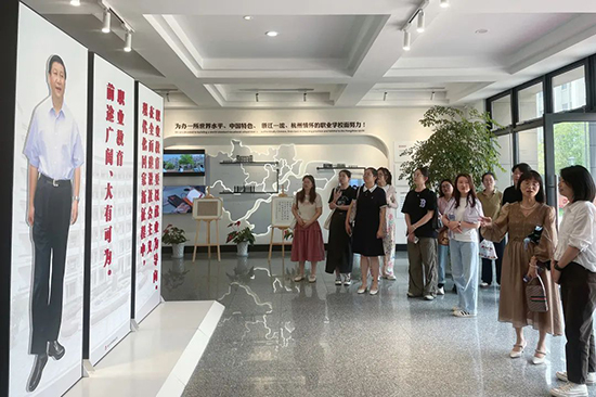 隨后,陳曉帶領一行人參觀校史文化長廊,在歷史沿革、教育理念、校園文化、學生培養的介紹和展示過程中,深刻感受到杭州市中策職業學校輝煌的發展史。