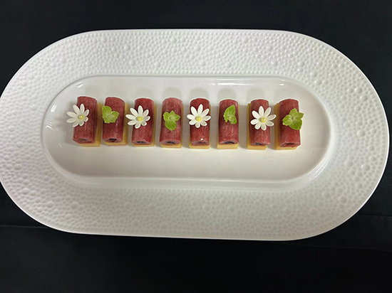 水蜜桃楊梅卷的研發(fā),不僅是校企雙方智慧與創(chuàng)意的結晶,更是兩地食材文化的一次精彩碰撞。在鮑佶杖老師和謝錡導師的精心指導下,這款甜點不僅在選材上嚴格把關,更在制作工藝上精益求精,力求將每一道細節(jié)都做到極致。其色澤鮮艷的外觀、酸甜可口的味道,讓人在品嘗的同時也能感受到夏日里的一絲清涼。