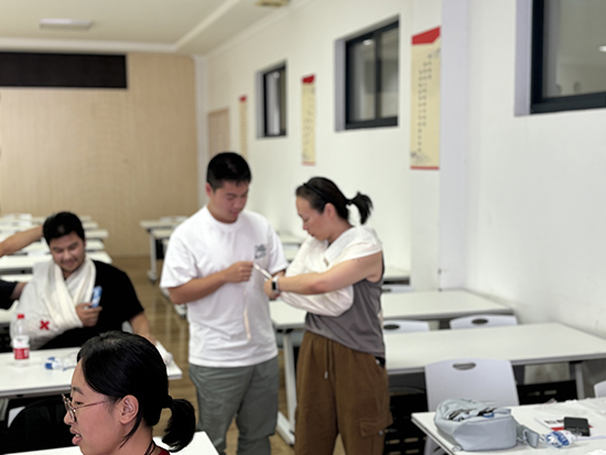 訓練營第二天,學員們在昌碩分院103教室集中學習了紅十字運動基本知識、救護知識概論,著重了解了心肺復蘇及自動體外除顫器(AED)的使用和氣道異物梗阻的解除等知識。授課教師浙江省紅十字會一級應急救護師丁柏偉還通過手把手教學指導各位學員進行實操練習,掌握常用急救技能。