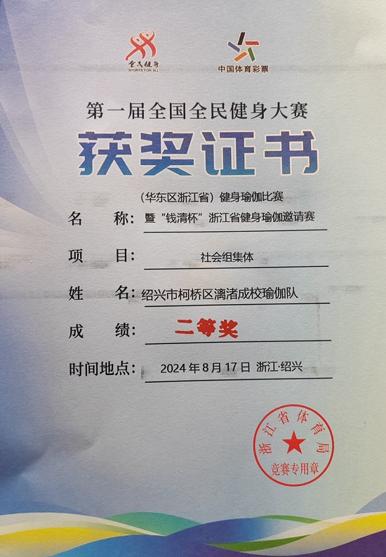 8月16日至18日,第一屆全國全民健身大賽(華東區浙江?。┙∩龛べけ荣愻哒憬〗∩龛べぱ堎愒诮B興市柯橋區錢清街道舉行,賽事吸引來自華東地區各省、市的23支隊伍參加??聵騾^漓渚成校瑜伽隊參賽榮獲集體項目二等獎。