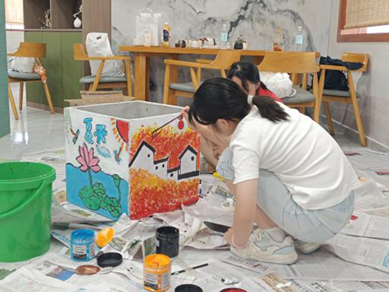 參觀溇港文化展示館后,同學(xué)們接到了“花盆彩繪”的任務(wù)書(shū),通過(guò)分組入戶走訪、調(diào)查等形式,對(duì)當(dāng)?shù)貧v史文化進(jìn)行實(shí)地調(diào)研,聽(tīng)取老一輩對(duì)古鎮(zhèn)往昔的回憶,了解村民對(duì)美好生活的精神需求。