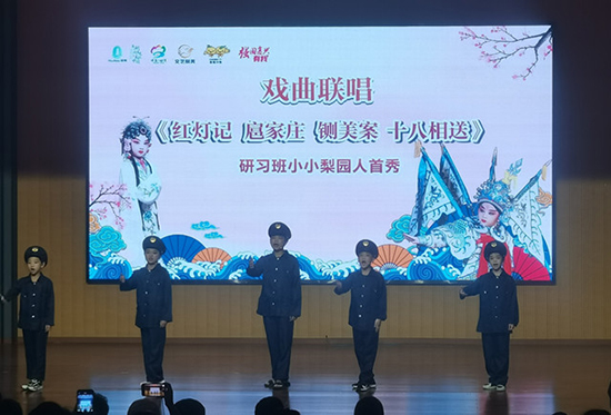 舞臺上,學員們個個精神飽滿。首先出場的是87歲的苕溪京韻社羅春蓮老師的現代京劇《沙家浜 奔襲》,羅老師將這個經典戲曲選段演繹得聲情并茂、鏗鏘有力,贏得了在場觀眾的陣陣掌聲和喝彩。接下來小小梨園人出場了,驚艷的扮相立馬就吸引了觀眾們的眼球。他們帶來的戲曲聯唱有唱腔高亢圓潤的《鍘美案》《紅燈記》《扈家莊》,有動作精煉滑稽的《哪吒鬧?!罚星{悠揚的《十八相送》,更是贏得觀眾們的陣陣掌聲。