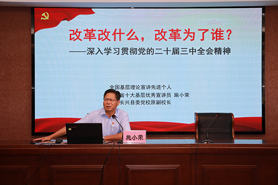 8月29日下午,學院特邀了全國基層理論宣講先進個人、浙江省十大優秀基層宣講員施小榮老師作了《改革改什么,改革為了誰——深入學習貫徹黨的二十屆三中全會精神》專題講座。施小榮老師以其風趣幽默的風格、鮮活生動的案例牢牢吸引了每一位教師。“中國共產黨第二十屆中央委員會第三次全體會議的總體概況、充分肯定工作成績、進一步全面深化改革的總目標和大會主題、進一步全面深化改革要貫徹的原則、中國式現代化的重要保障”等內容生動地呈現在老師們面前,學習期間會場掌聲不斷、笑聲連連,老師們在輕松愉快的氛圍中不斷思考,深刻領會黨的重大決策部署。