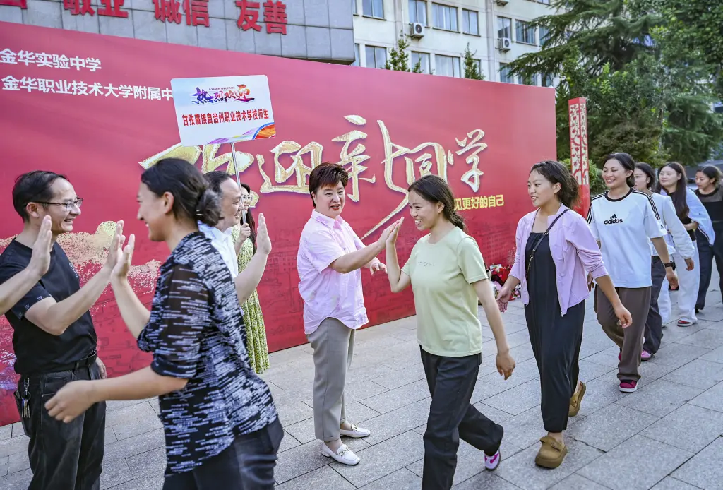 “歡迎你們來到金華實(shí)驗(yàn)中學(xué)!”9月1日,一輛滿載著甘孜和婺城情誼的大巴車停靠在金華實(shí)驗(yàn)中學(xué)(以下簡(jiǎn)稱“實(shí)中”)校園內(nèi),婺城區(qū)教育局黨組成員、實(shí)中黨總支書記俞秀玲及校領(lǐng)導(dǎo)班子和車上走下來的37名學(xué)生一一擊掌。他們是金華市中職學(xué)校首批、實(shí)中首屆首批浙甘班學(xué)生,來自甘孜藏族自治州職業(yè)技術(shù)學(xué)校,當(dāng)天跨越兩千多公里來到婺城,將在這里開啟新的求學(xué)之旅。