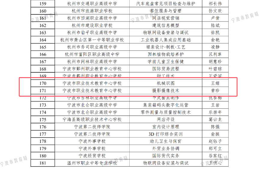近日,浙江省教育廳辦公室公布了2023年職業(yè)教育一流核心課程的教學(xué)項(xiàng)目名單。寧波市職業(yè)技術(shù)教育中心學(xué)校王姬老師領(lǐng)銜的《機(jī)械識(shí)圖》課程,團(tuán)隊(duì)成員徐吳、余挺挺;曾珍老師領(lǐng)銜的《攝影攝像技術(shù)》課程,團(tuán)隊(duì)成員余勁松、駱龍譽(yù)、翁詩(shī)奇,雙雙上榜被認(rèn)定為職業(yè)教育一流核心課程(線下課程)。職業(yè)教育一流核心課程以先進(jìn)的教學(xué)內(nèi)容、規(guī)范的課程標(biāo)準(zhǔn)、優(yōu)秀的教學(xué)團(tuán)隊(duì)、創(chuàng)新的教學(xué)方法、多元化的評(píng)價(jià)體系為特點(diǎn),通過(guò)省級(jí)教育部門的審核與認(rèn)定,成為職業(yè)教育領(lǐng)域的示范和引領(lǐng),從而提升整個(gè)職業(yè)教育的教學(xué)質(zhì)量和人才培養(yǎng)效果。