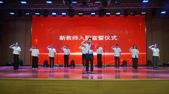 “我宣誓——我志愿成為一名人民教師,忠誠黨的教育事業(yè),遵守教育法律法規(guī)……”9名新教師在嘉興市中小學(xué)師德楷模李德恒老師帶領(lǐng)下莊嚴(yán)宣誓,接受入職第一課,正式開啟教書育人的新征程。隨后,新教師向指導(dǎo)師父獻(xiàn)花、行拜師禮,一個儀式,架起了一座座“青藍(lán)”之橋,凝“新”而聚,任重道遠(yuǎn)。