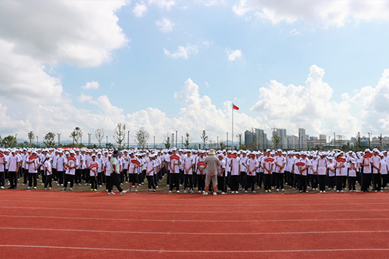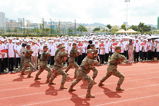 隨著激昂的《義勇軍進行曲》響起,五星紅旗飄揚在空中,全體師生莊嚴(yán)肅立,新生軍訓(xùn)開營儀式在雄壯的國歌聲中拉開序幕。