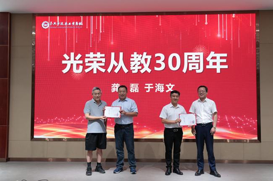 歲月靜好,秋收滿園。大會上,還為徐水華、徐文婕兩位教師舉行了榮休歡送儀式,為龔磊、于海文兩位30年教齡的教師頒發證書。四位老教師圍繞校園老榆樹,共吟詩篇,以深情厚誼,細述建校滄桑。詩行間,激勵全體教師矢志不渝秉持初心,將教書育人的神圣使命鐫刻于心、踐之于行,繼續為教育事業貢獻自己的智慧與力量。