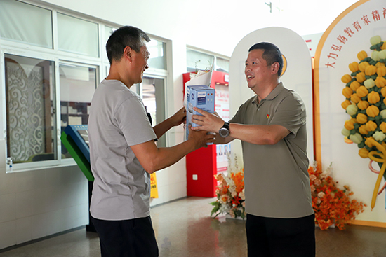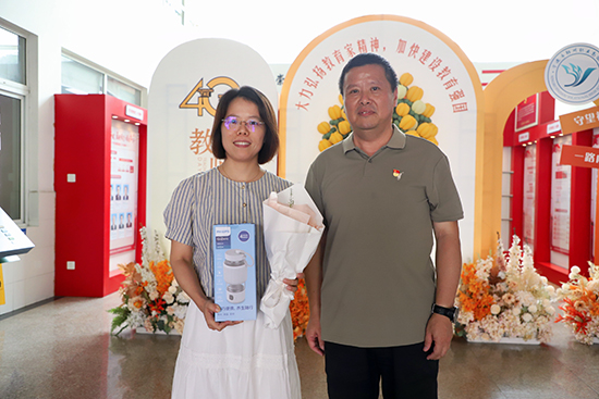校領(lǐng)導(dǎo)為教師們分發(fā)教師節(jié)禮物:一束代表詩(shī)意的鮮花和一份代表生活的禮品,寄托了學(xué)校對(duì)全體教職員工“既能腳踏實(shí)地,又能心懷詩(shī)意”的期望。“教師節(jié)快樂(lè)!”一聲簡(jiǎn)單卻溫馨的祝福,溫暖了大家的心。張校長(zhǎng)和老師們親切交流并合影留念,場(chǎng)面熱鬧歡馨。